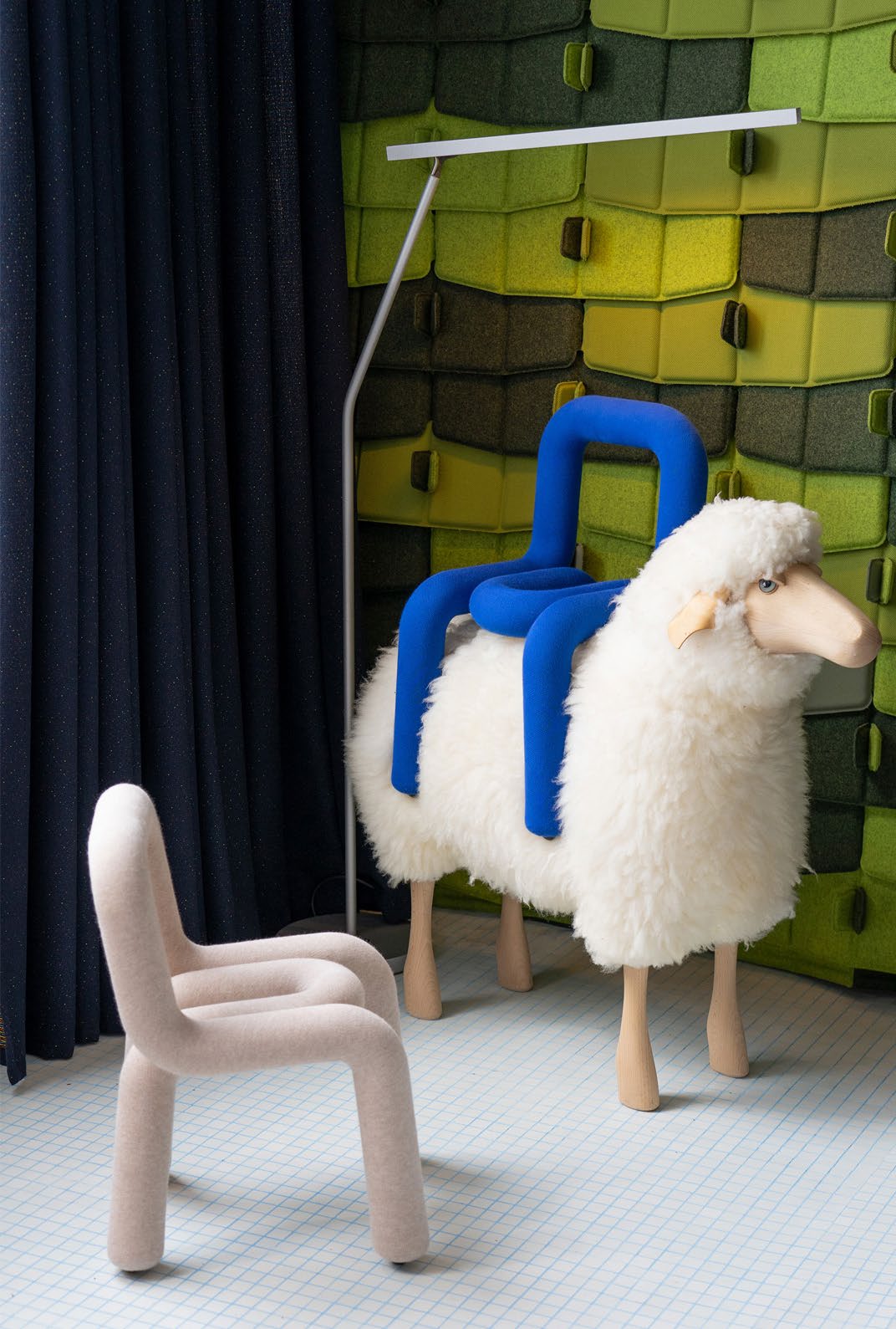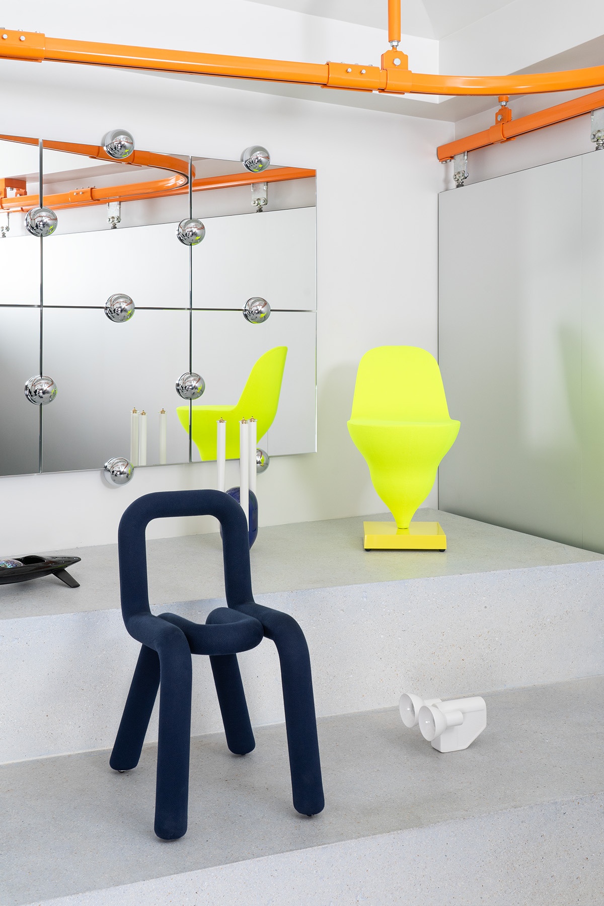During a visit to Drisag, a Belgian upholstery company, the designers experimented with wrapping polyurethane foam directly around the metal tube frame. This innovation softened the rigid structure, creating an inviting form that was both tactile and visually striking.