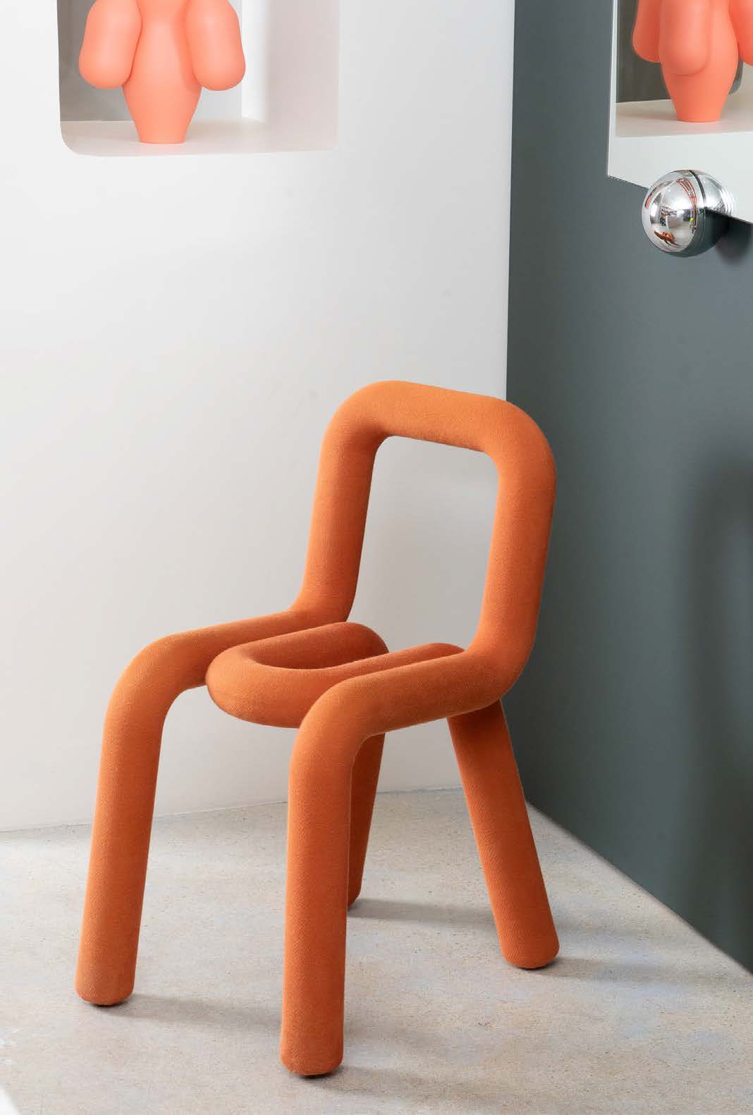 The name says it all. In typography, “bold” means making a line thicker to highlight its presence. Here, the designers applied the same idea to form — thickening a steel line with foam and fabric to create an expressive, designer chair that feels both modern and playful.