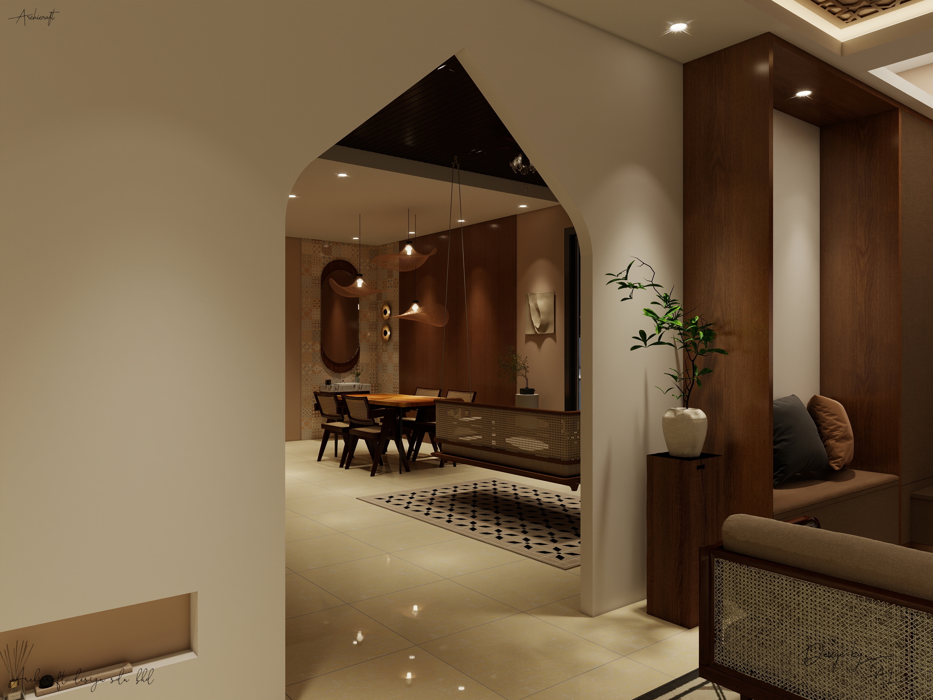 Repetitive Islamic geometry is reimagined through wood panels, lattice screens, and laser-cut dividers. These features serve as both decoration and functional privacy solutions in open-plan living.