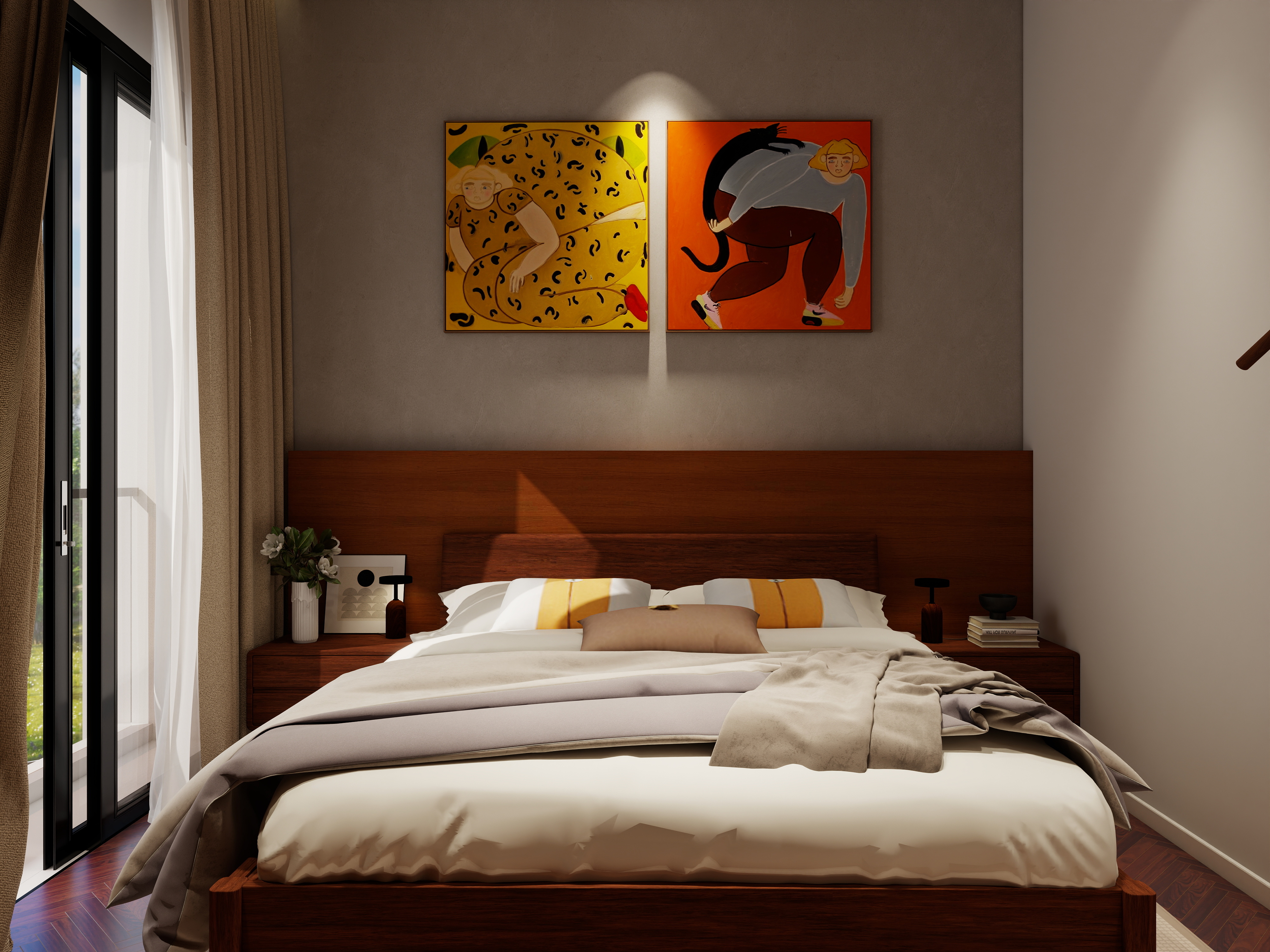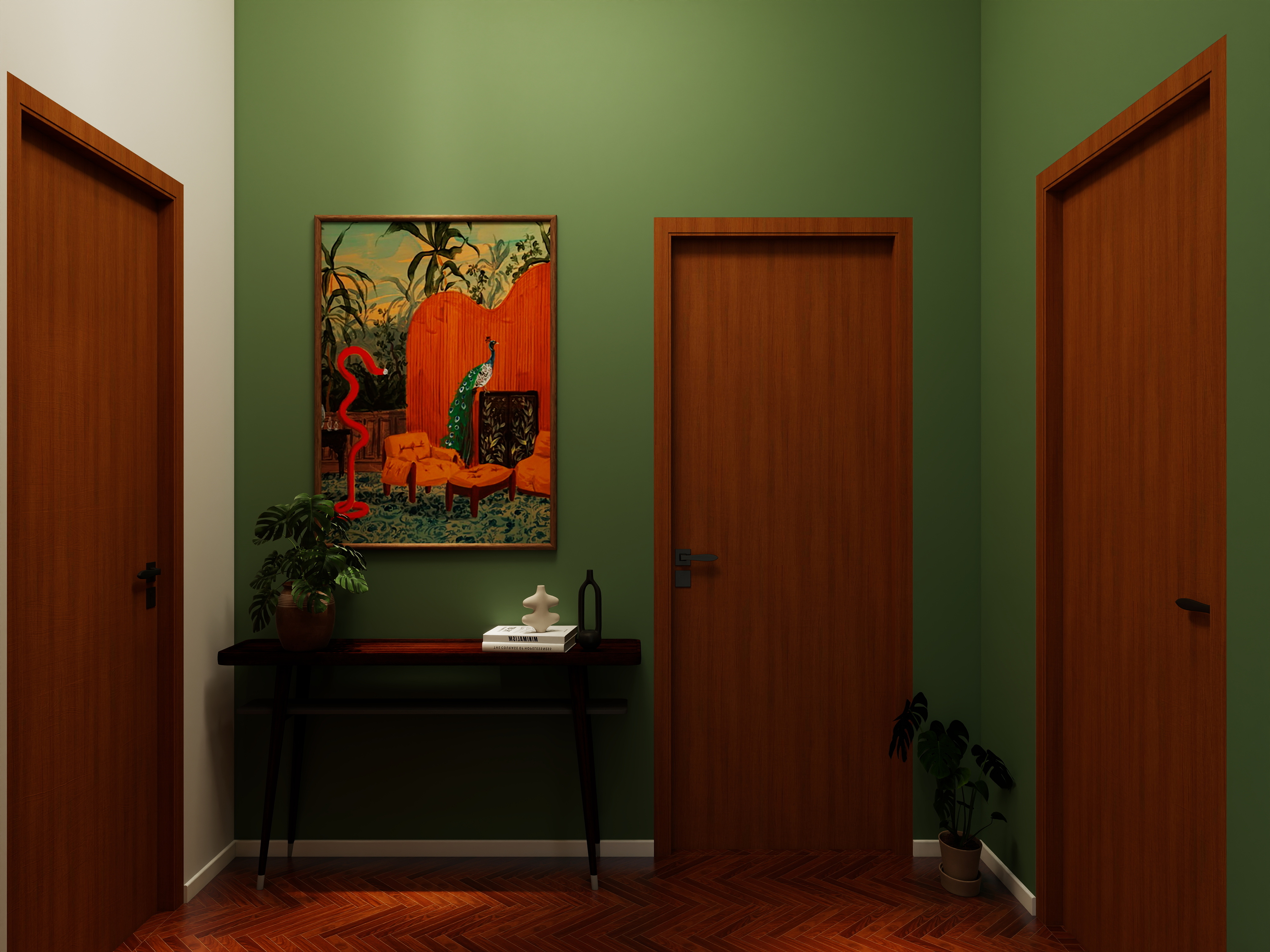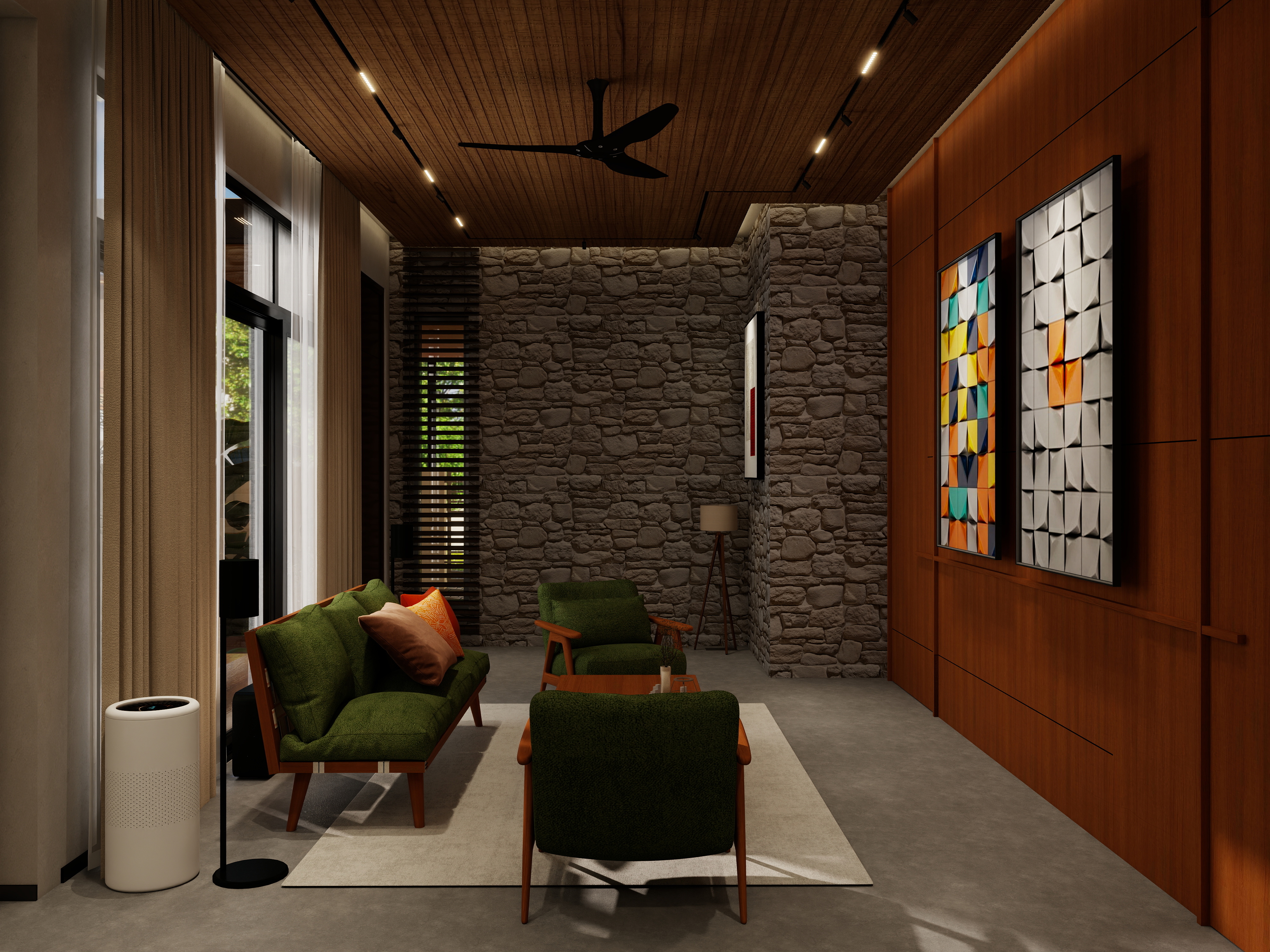 In this project, the green sofas, rust-orange cushions, and vibrant geometric wall art establish a perfect balance between comfort and creativity. These tones infuse personality into the home while maintaining a cohesive, elegant atmosphere.