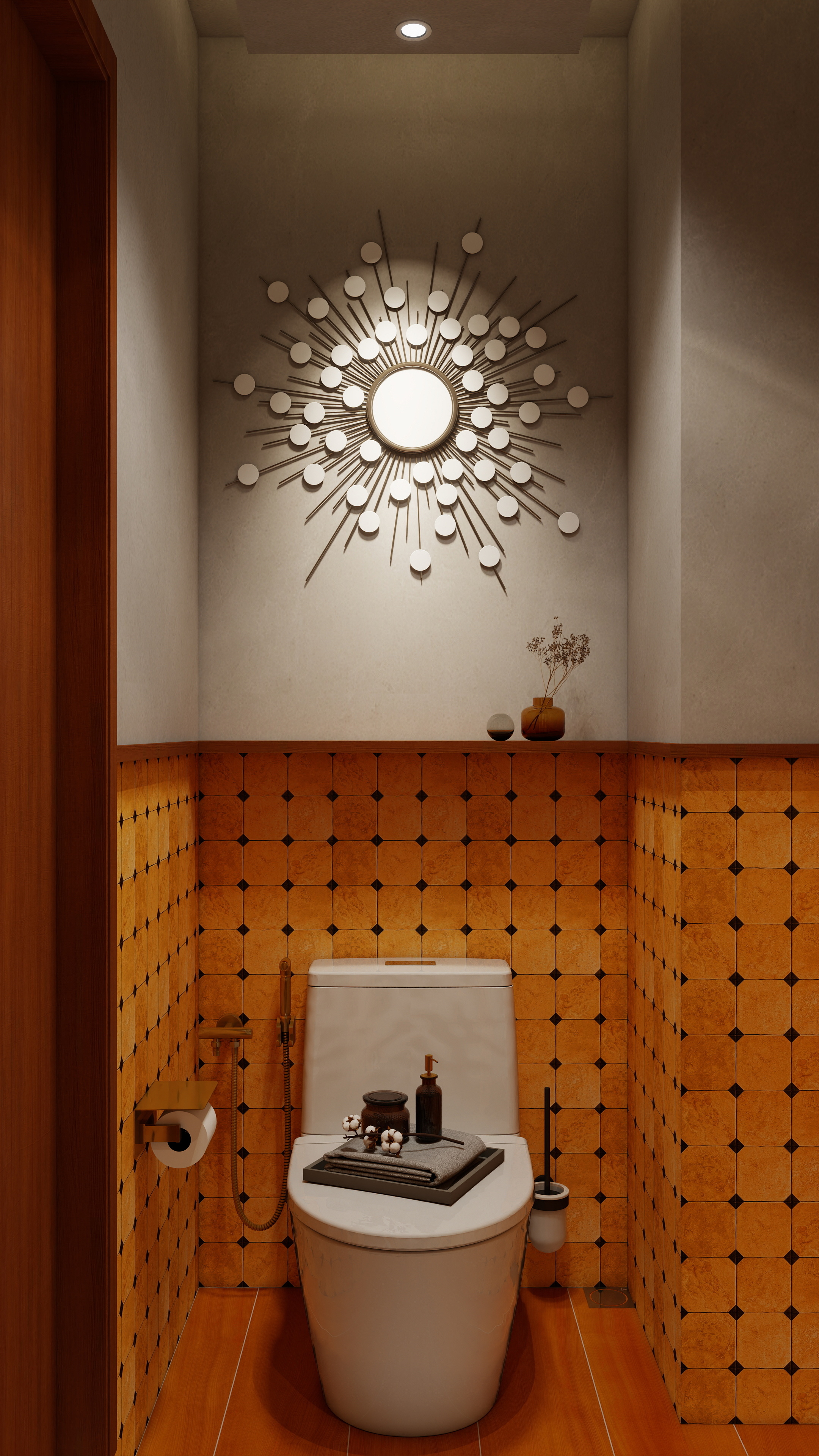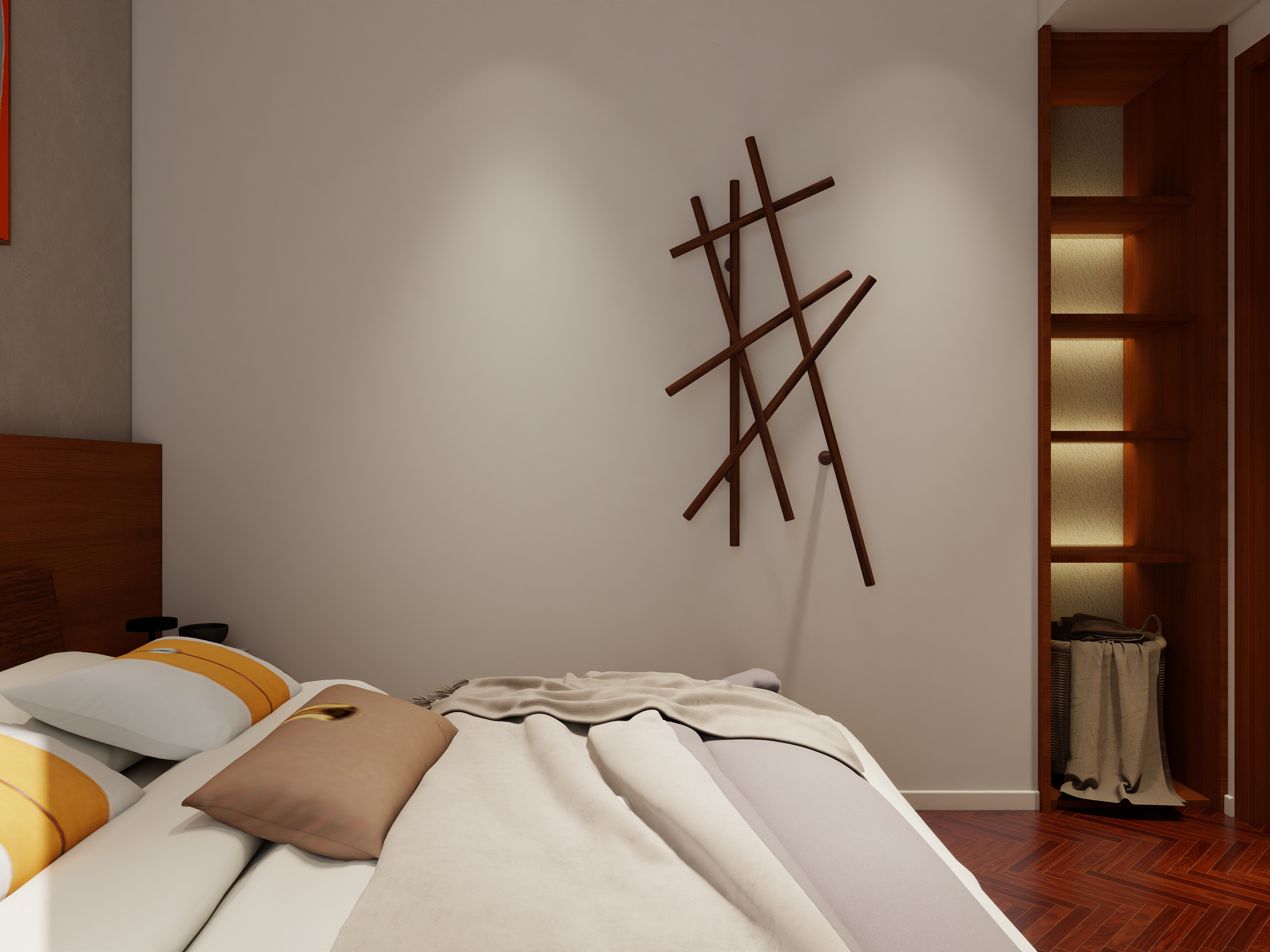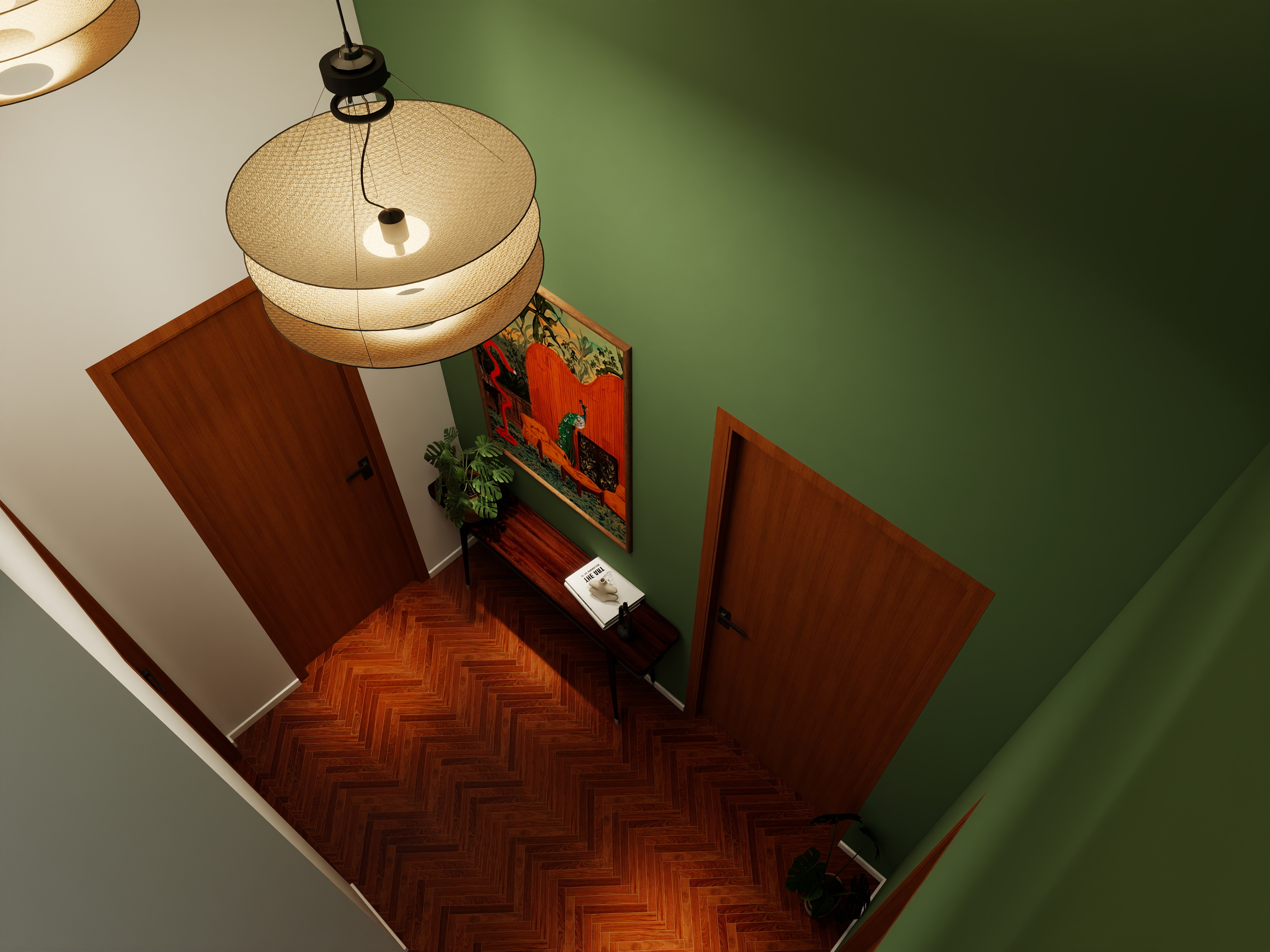 In this project, the green sofas, rust-orange cushions, and vibrant geometric wall art establish a perfect balance between comfort and creativity. These tones infuse personality into the home while maintaining a cohesive, elegant atmosphere.
