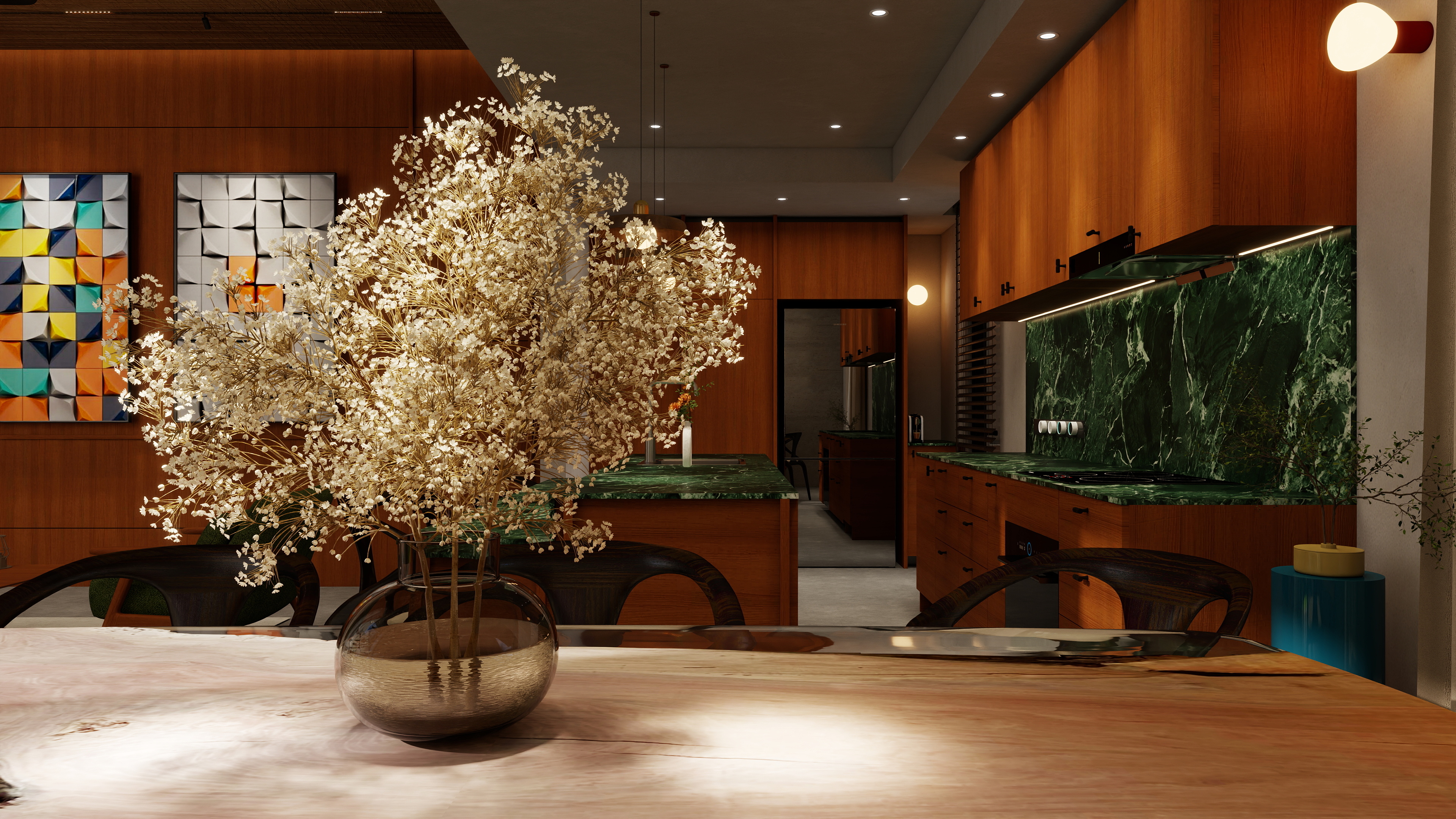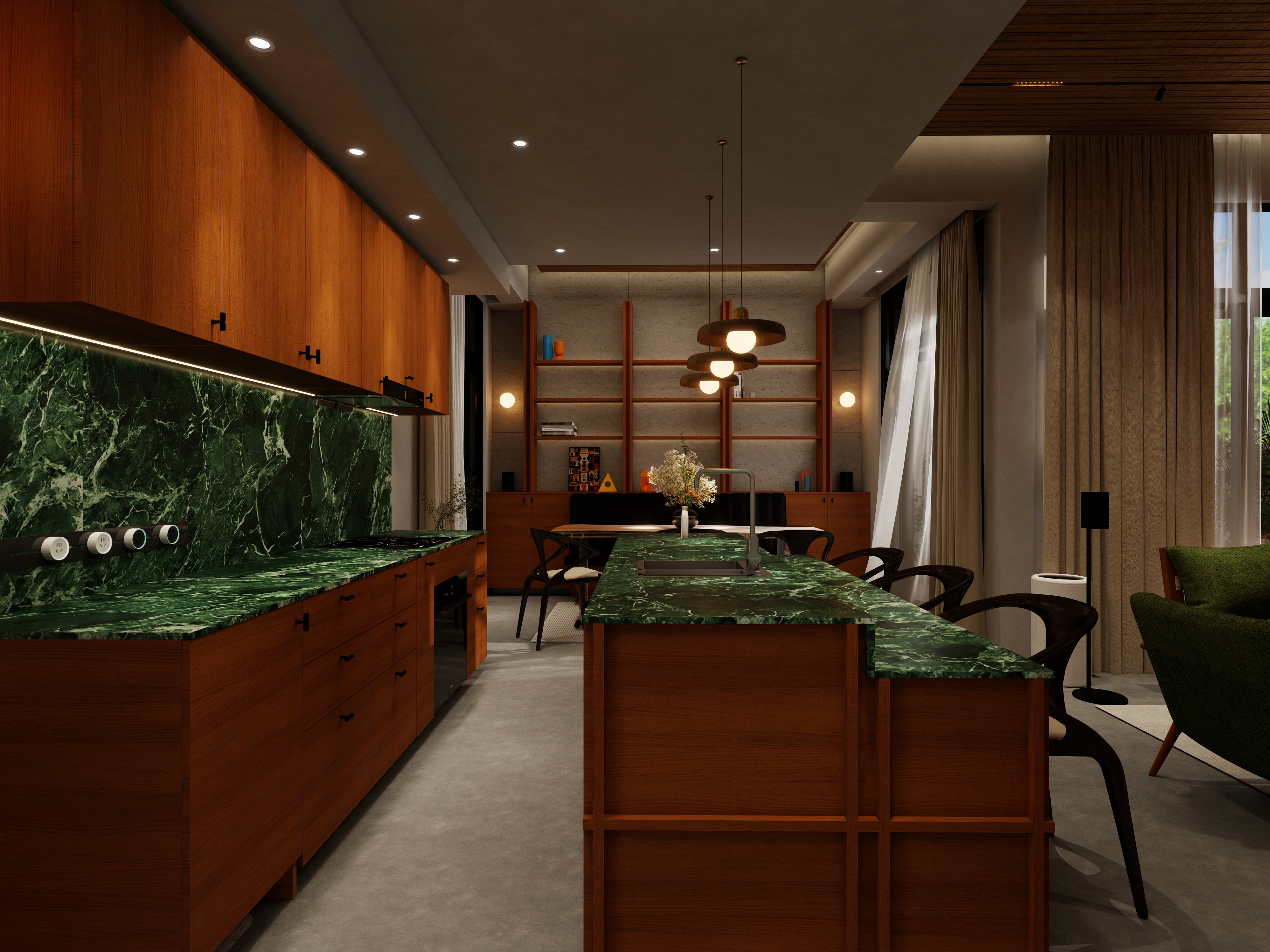 Warm ambient lighting, statement pendant lamps, and sculptural fixtures all play a part in creating comfort and intimacy. In your living area, pendant lights highlight the stunning green marble feature wall, while wall sconces and recessed lighting bring a soft glow that enhances the wood tones and textures.