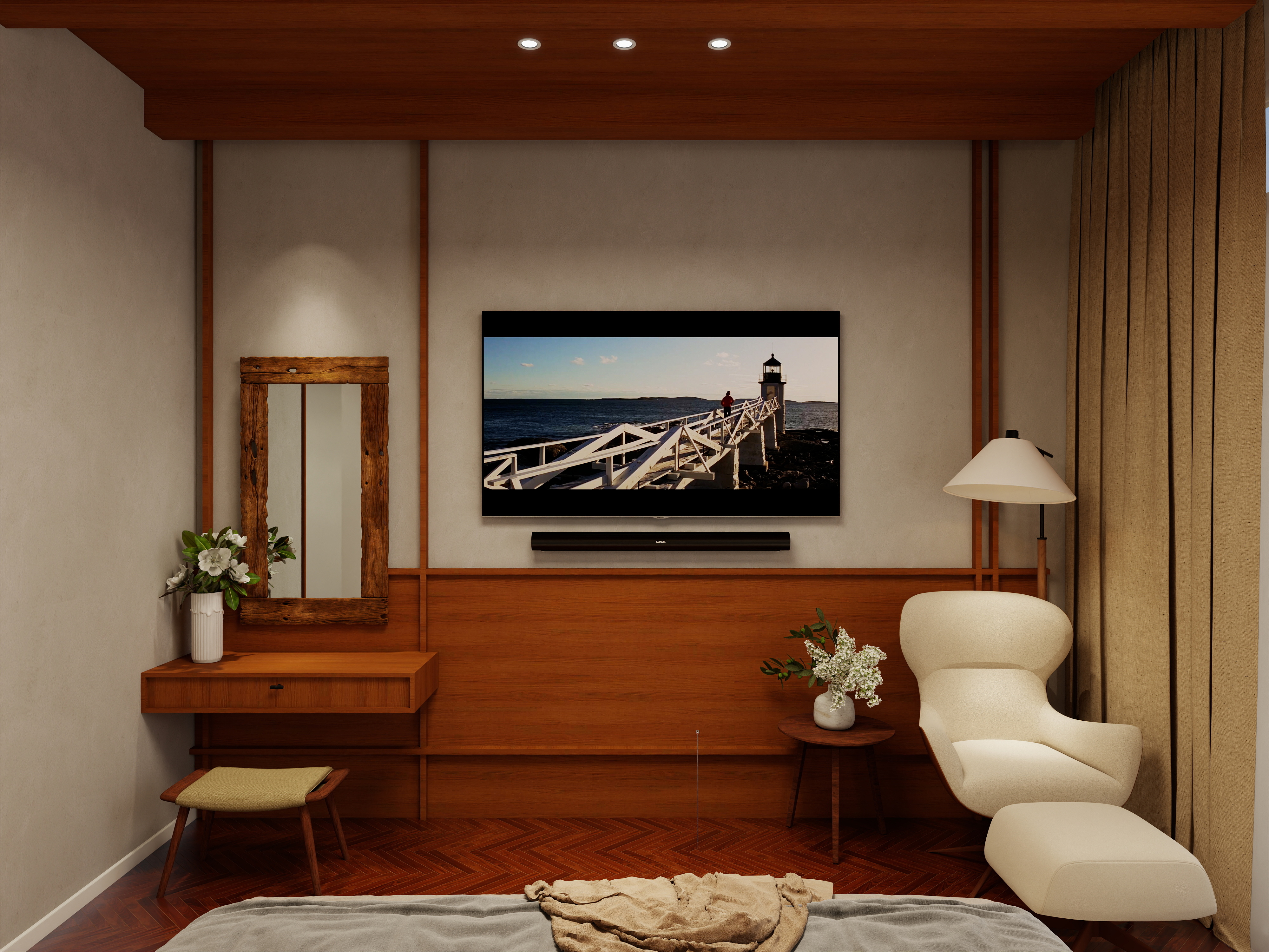 The foundation of Mid-Century Modern interiors lies in the beauty of natural materials. Teak, walnut, oak, and rosewood are commonly used to introduce warmth and texture, often paired with modern finishes like brushed metal, glass, and marble.