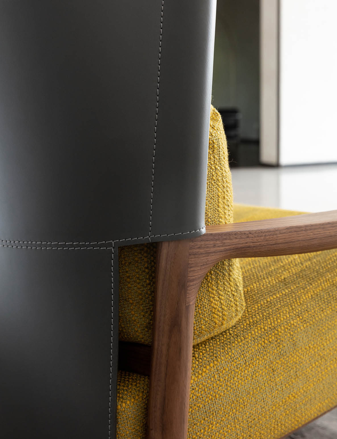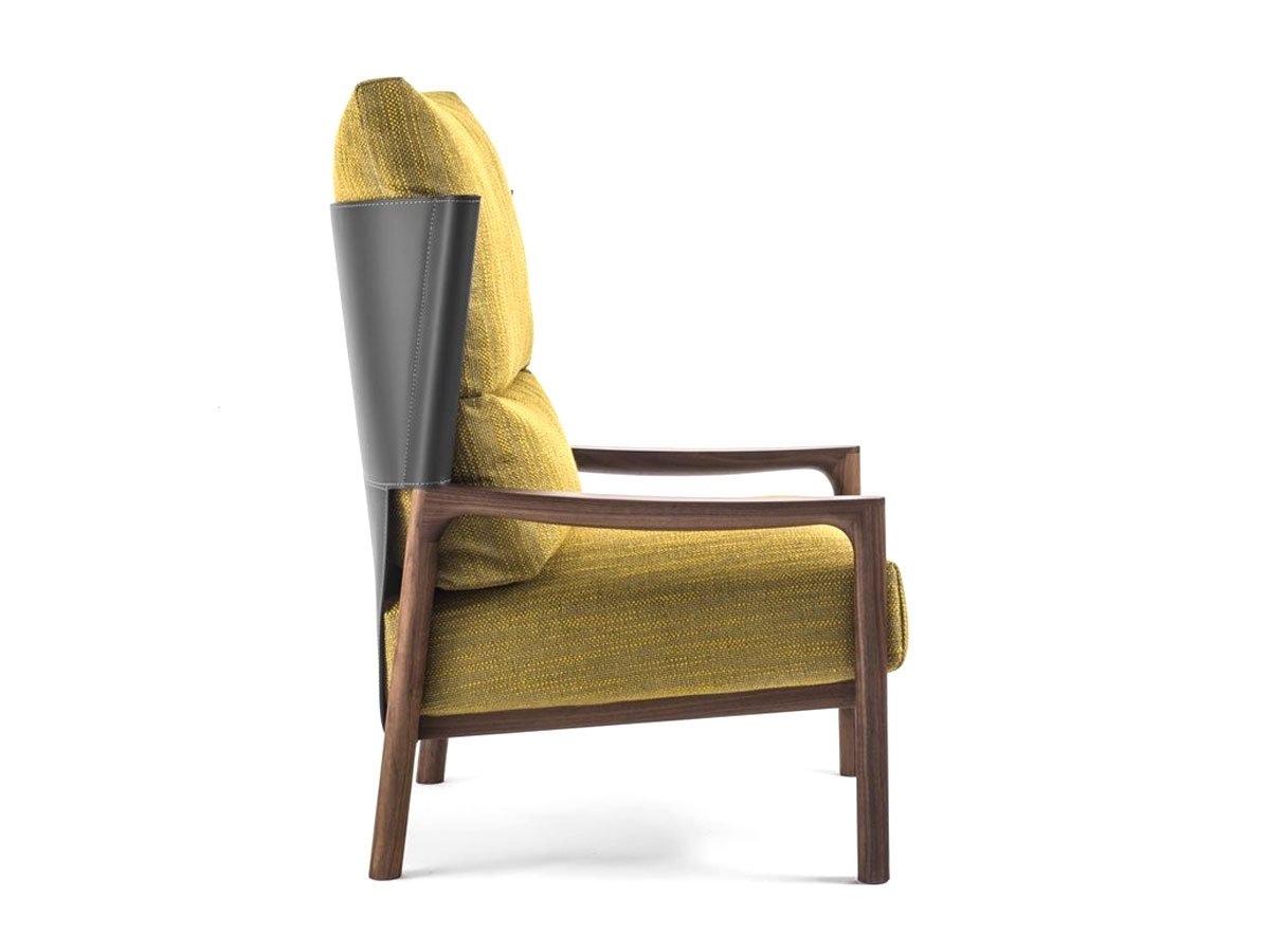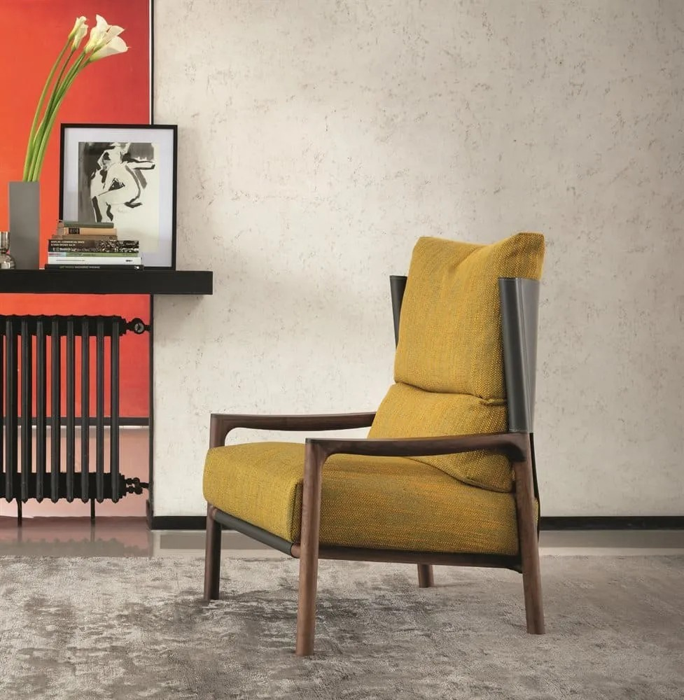 The VERA’s structure is an interplay of solid walnut wood, metal detailing, and plush upholstery — a combination that reflects the Buratti brothers’ architectural roots and sensitivity to human experience. The mustard-yellow fabric adds warmth and energy, contrasting beautifully with the refined timber frame and the cool metal that outlines the backrest.