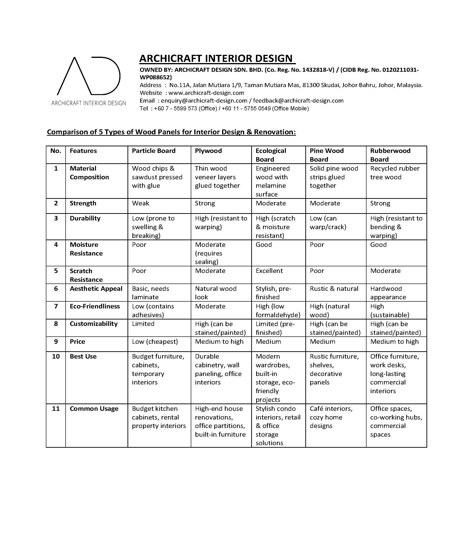 For professional consultation on interior design and renovation in Johor Bahru, contact experienced designers such as Archicraft Design Sdn Bhd to ensure the best wood panel selection for your project!