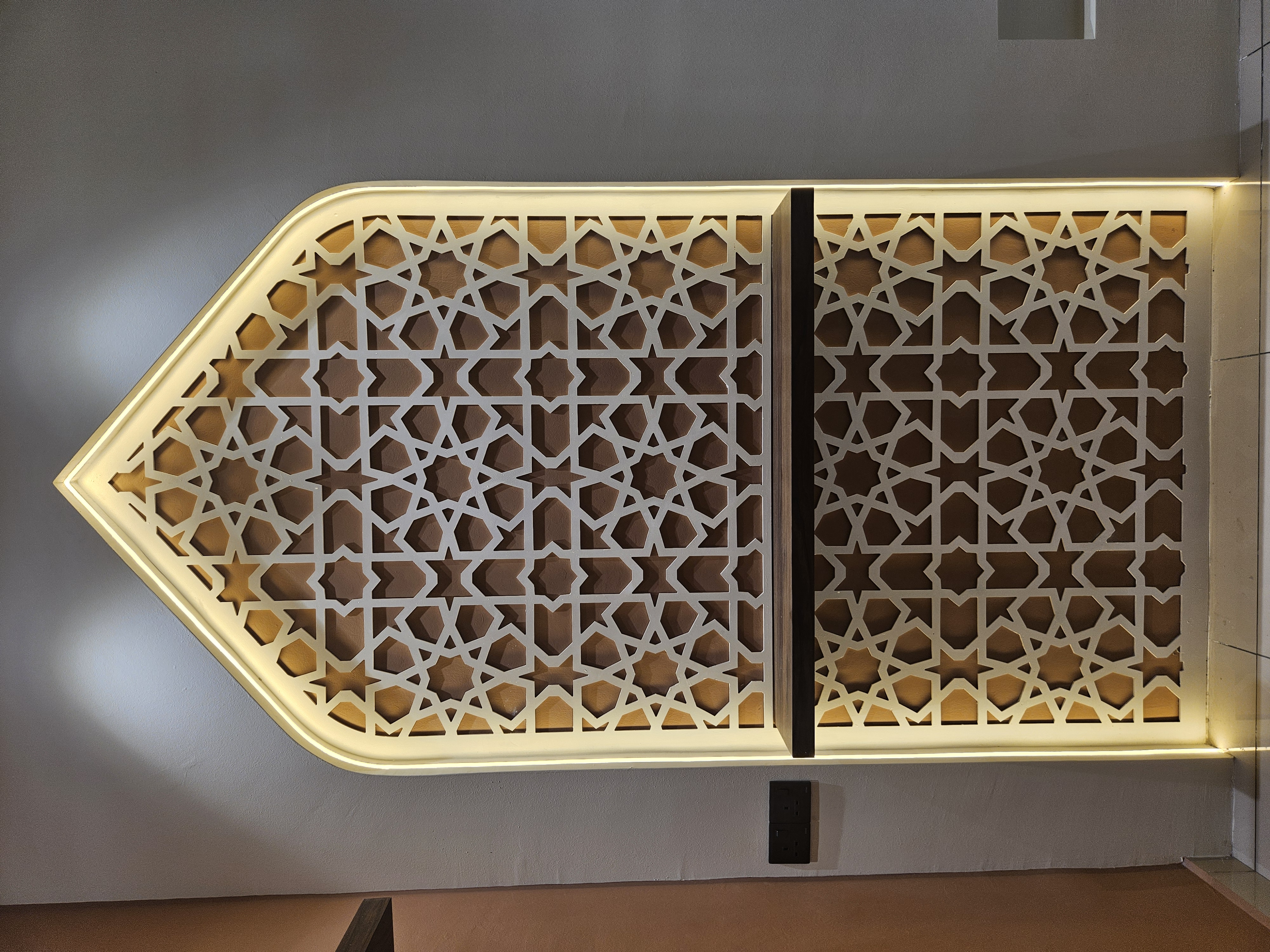 As you enter the home, the eye is immediately drawn to the arch — a familiar form in Islamic architecture, reimagined here with clean edges and soft illumination. It stands not as decoration, but as a welcome. Behind it, Islamic geometric patterns unfold in perfect rhythm, glowing gently through warm backlighting.