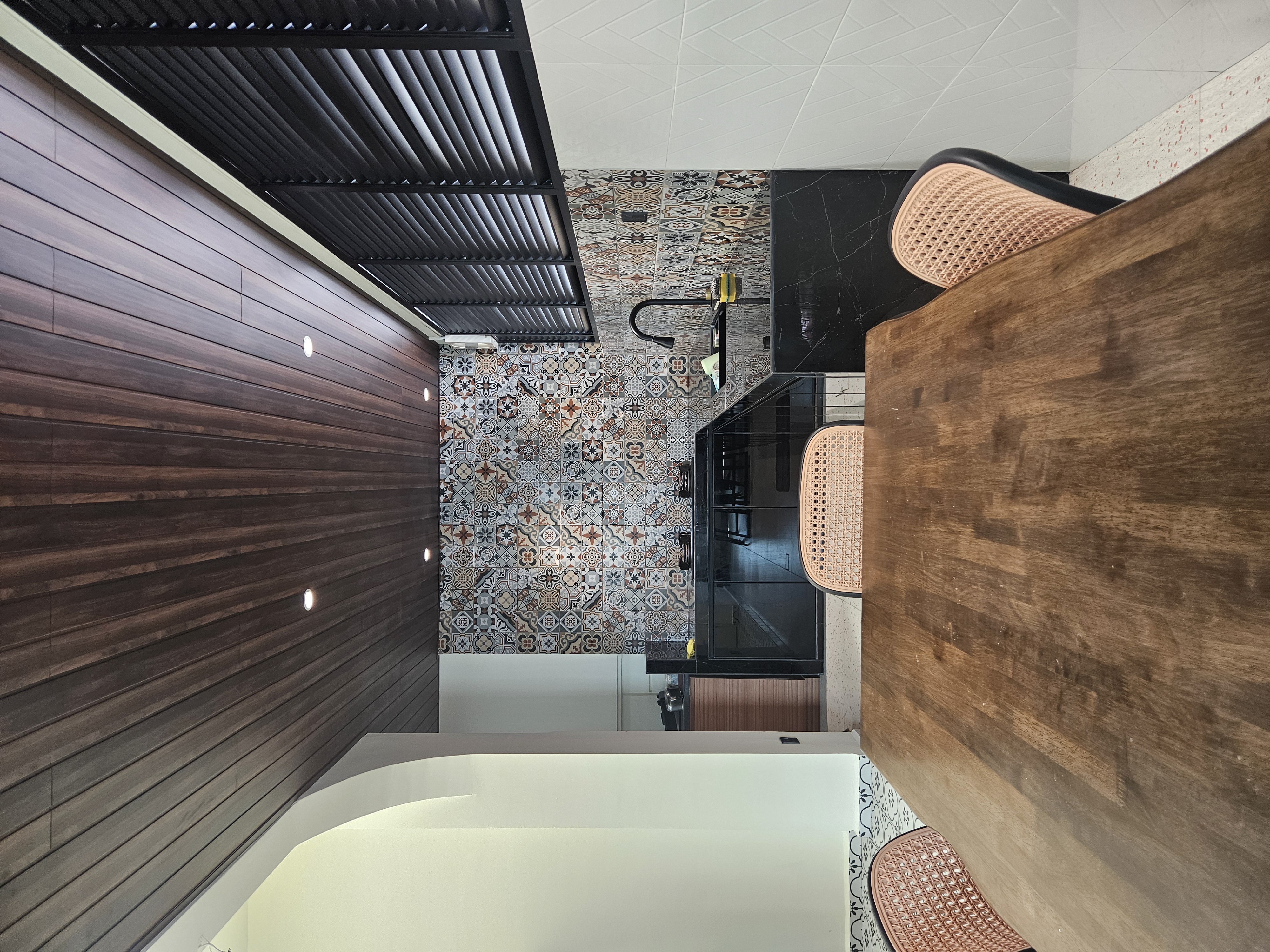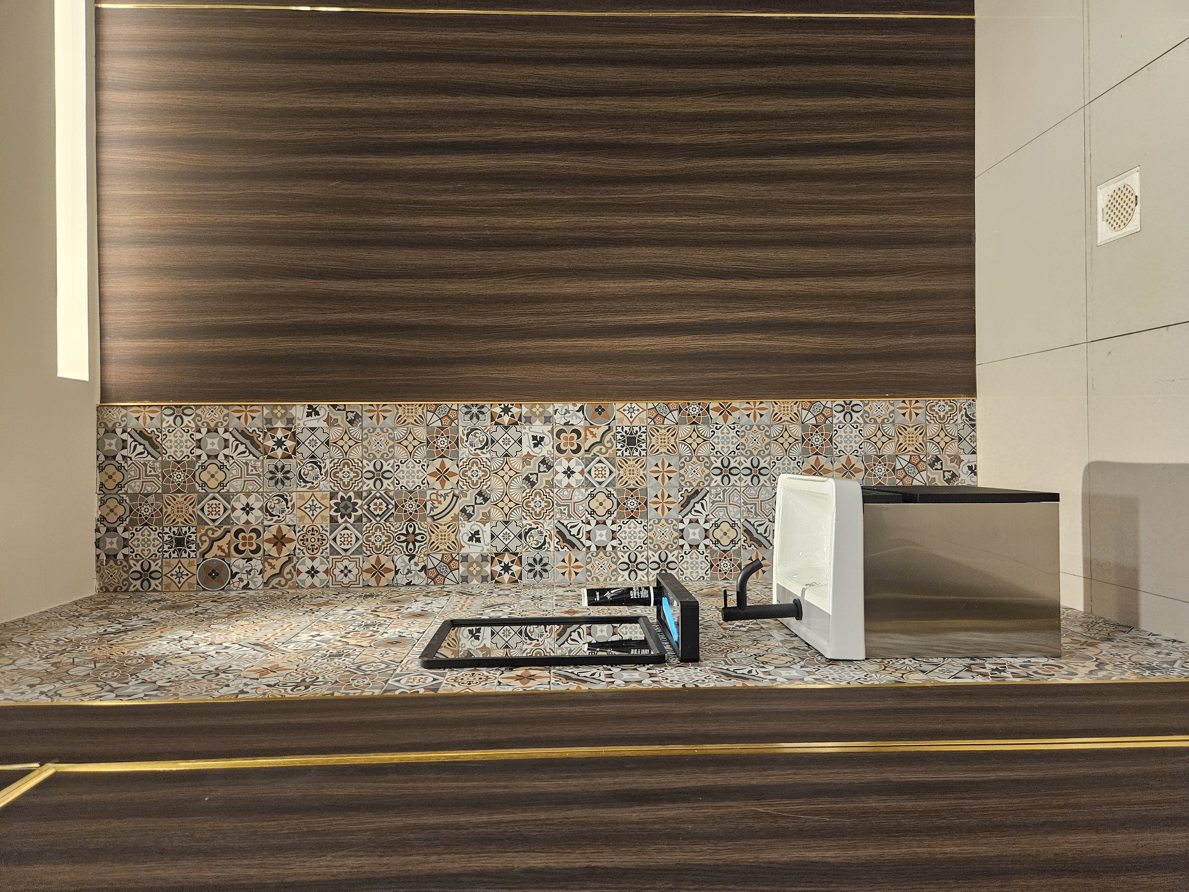Even the most functional spaces are treated with care. In the wash area, patterned tiles inspired by traditional Islamic motifs add depth and character. Warm wood panels soften the space, while modern fittings keep it clean and contemporary.